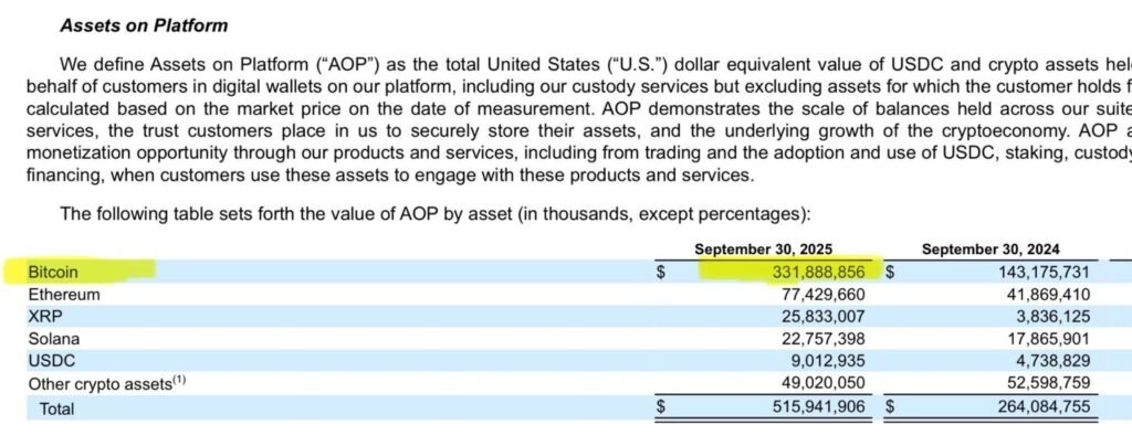 Coinbase reported holding $331.9 billion worth of Bitcoin on its platform as of September 30, 2025, according to newly released figures. The total represents roughly 2.8 million BTC, giving the exchange custody over about 14% of the cryptocurrency’s circulating supply.