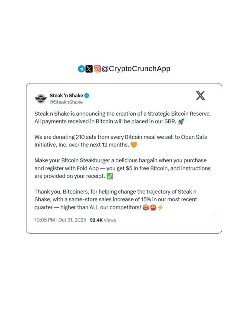 Bitcoin rewards platform Fold Holdings (FLD) has announced a limited-time partnership with Steak ‘n Shake, giving customers the chance to earn bitcoin with their meals. Starting Friday, anyone who buys a Bitcoin Burger or Bitcoin Meal can upload their receipt to bitcoinmealdeal dot com to claim $5 in bitcoin via the Fold app. Once users sign up on the app, they can redeem their reward and continue earning BTC on future purchases.