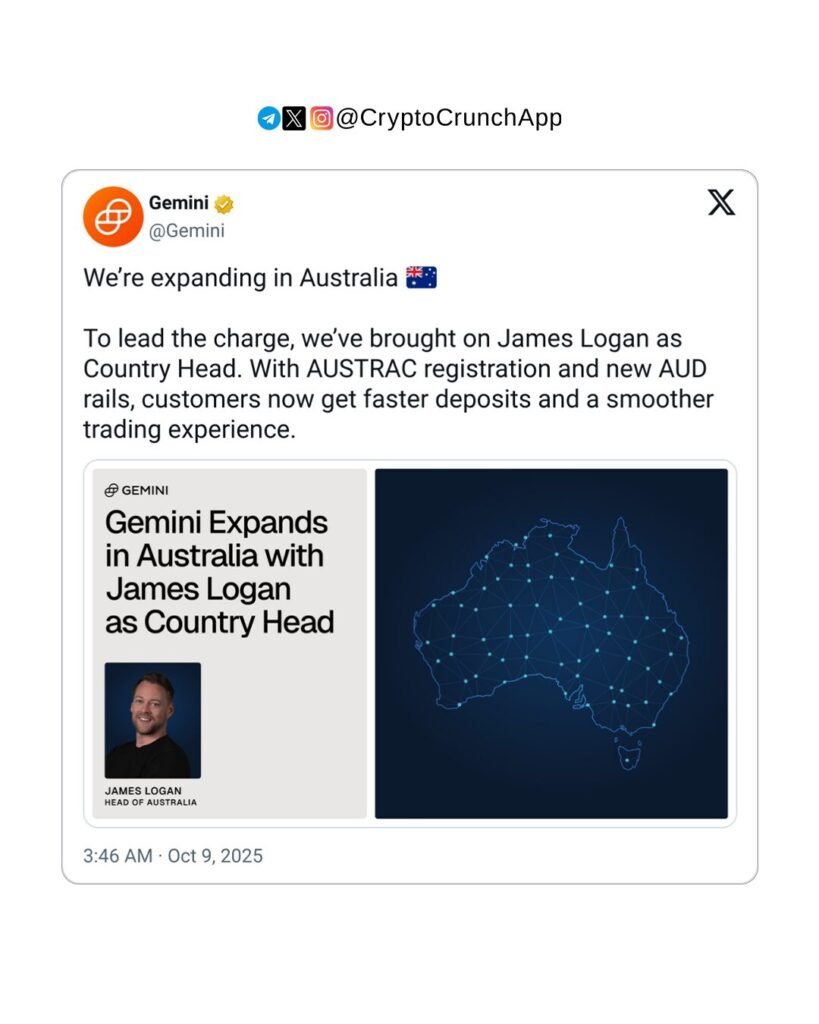 To strengthen its local presence, Gemini has appointed James Logan as Head of Australia. Logan, formerly with Luno and Bitget, will lead efforts to build a safe, transparent, and compliant ecosystem for retail and institutional investors across the region.