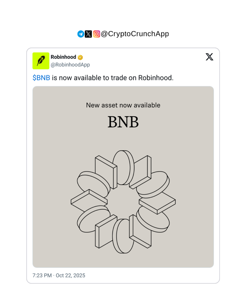 Robinhood has officially added support for Binance’s native token, BNB, giving its 27 million funded users access to the world’s fourth-largest cryptocurrency by market capitalization. The move marks another major step in mainstream adoption, coming shortly after Coinbase placed BNB on its listing roadmap, signaling growing U.S. exchange acceptance of Binance’s ecosystem.
